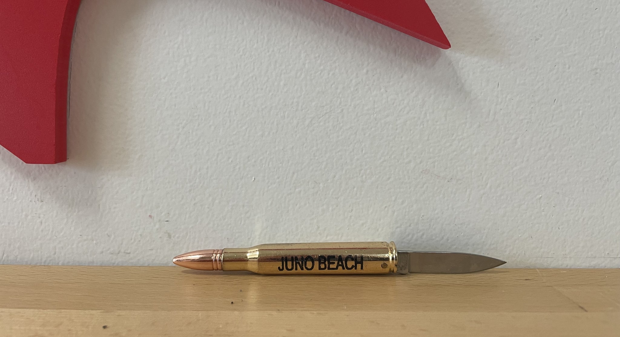 Petit couteau en forme de balle de fusil avec une inscription Juno Beach.